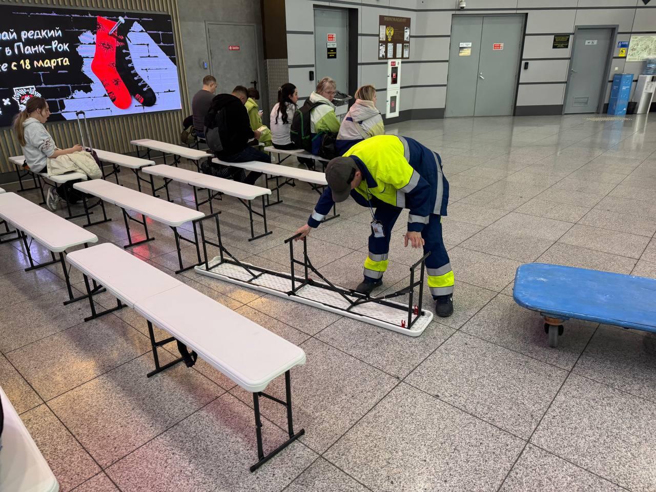 Ожидающим вылет также организовали места для сидения и раздали коврики.